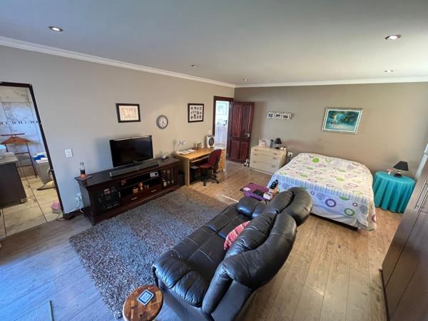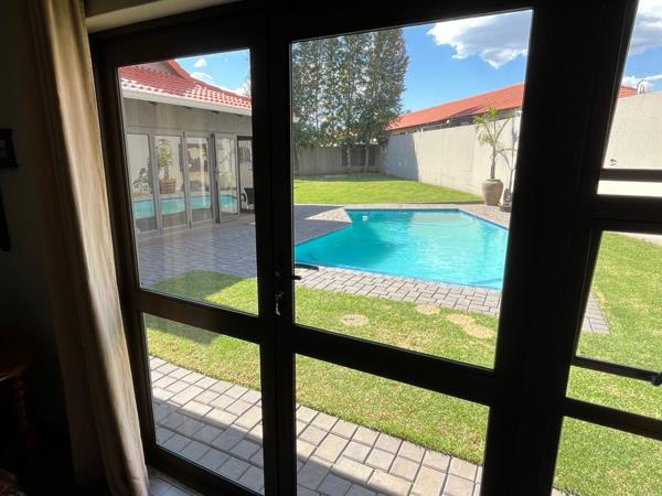 Outdoor living is a highlight, with large glass and sliding doors opening to a private swimming pool, a lush green lawn, and a paved patio area, perfect for alfresco dining and recreation. A built-in braai further enhances entertainment possibilities. The property sits on a generous 1138 sqm erf, offering ample outdoor space and a balcony for enjoying the surroundings. Parking includes two garages and a covered carport.