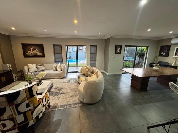 Step inside to an inviting entrance hall that flows seamlessly into the spacious, open-plan living and dining areas. These zones are designed for comfort and entertaining, featuring modern large-format floor tiles, recessed lighting, and air conditioning for climate control. Large sliding glass doors connect the interior to the outdoor spaces, bathing the rooms in natural light. The modern kitchen is a chef''s delight, equipped with light wood cabinetry, dark granite countertops, integrated appliances, and ample storage, including a built-in wine rack.
