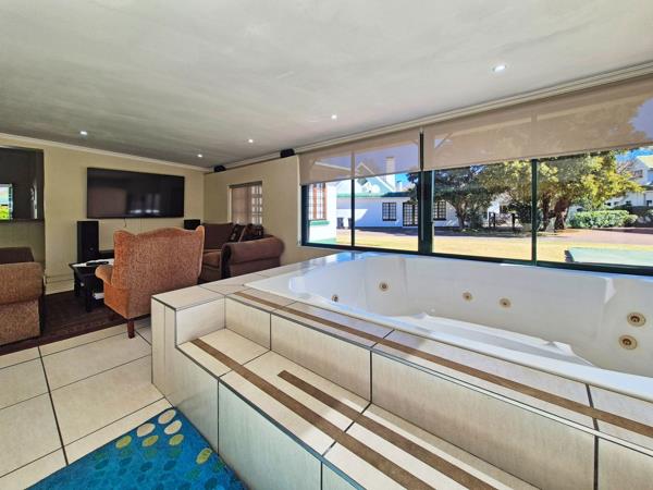 Expansive lounge, dining, and entertainment space with a large jacuzzi