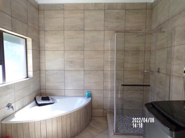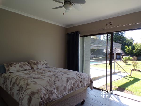 5 bedrooms with BIC''s, 4 modern bathrooms, lounge, TV room, dining room, stylish solid wood kitchen, scullery, laundry room, double garages, carport for 2 cars, 2 flatlets, lapa and a pool, equipped borehole, irrigation system,10 000Litres tank connected to the house as well. 3 of the bedrooms have sliding doors that goes out to the pool and lapa.