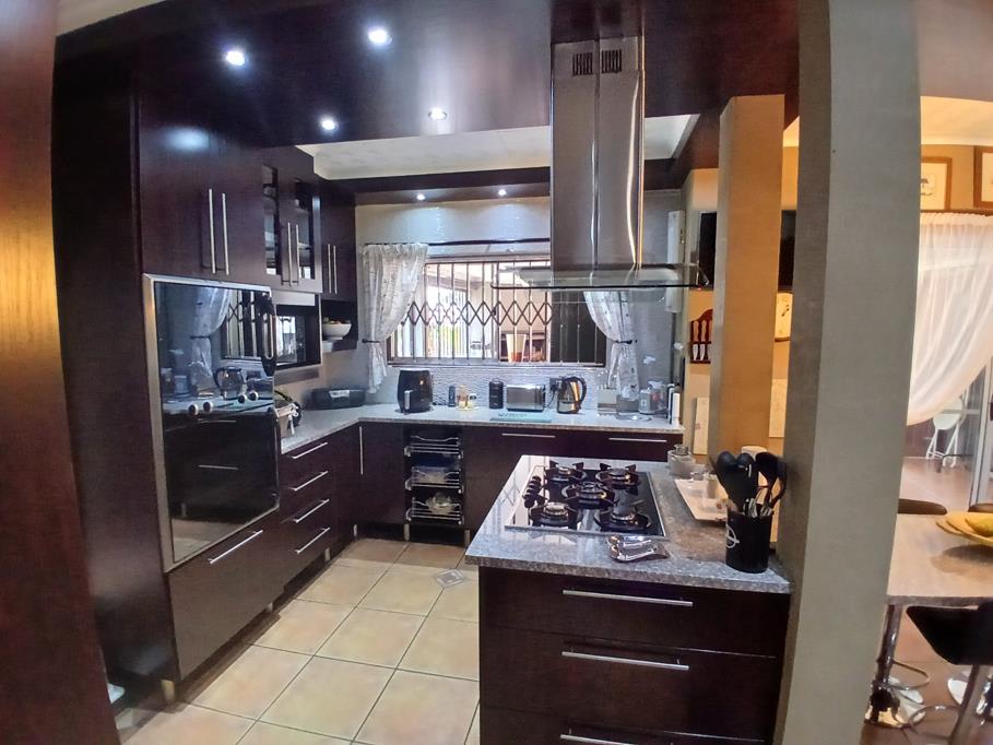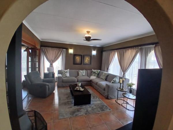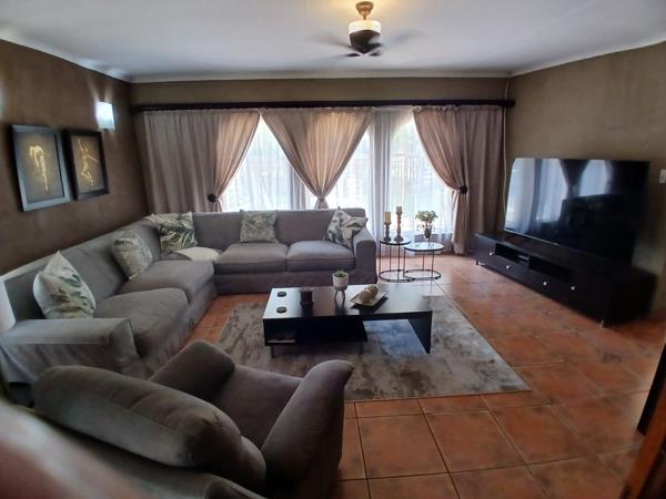 The property offers a beautiful kitchen with a gas stove as well as 2 electric ovens and well built-in cupboards. It offers a breakfast nook as well. Next to the kitchen is the laundry that has cupboards as well. The entrance hall is well done and furnished. The Tv room and dining room are open-plan, the dining room offers a Bar. It is a beautifully well done property. Ceilings and tiles are well done. The main bedroom offers an en-suite that is not divided from the bedroom itself. The entertainment room offers a guest toilet, built-in braai and ample space to use. The space is enclosed. The pool is next to the Lapa with a braai area, paved and a deck. The 2nd bathroom offers a complete bathroom with a bath tub and a shower. The main bathroom has a Jaccuzzi bath. Double garage with a carport. Cameras and alarm for security reasons. Air conditioner for winter and summer days. It is an entertainers palace.