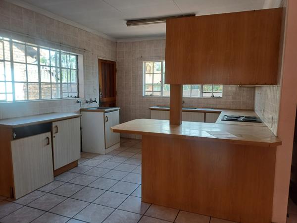 Inside, the unit features a spacious lounge area, complete with durable tiled flooring and a ceiling fan for comfort. Large windows, fitted with security bars, allow ample natural light to fill the space. The functional kitchen boasts extensive light wood cabinetry, a built-in electric hob, and an oven, alongside generous countertop space and a practical breakfast bar. Tiled walls and floors ensure easy maintenance, though the aesthetic offers potential for modern updates to truly personalize the space.