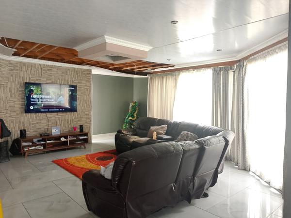 The home features 5 spacious bedrooms and 2 bathrooms, with the main bedroom offering an en-suite full bathroom and a walk-in closet. Living areas include a lounge, dining room, TV room, fully fitted kitchen, scullery, and separate laundry. There''s a study room.