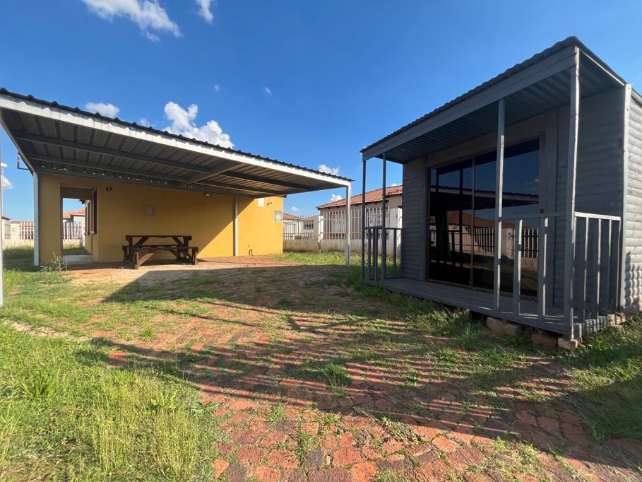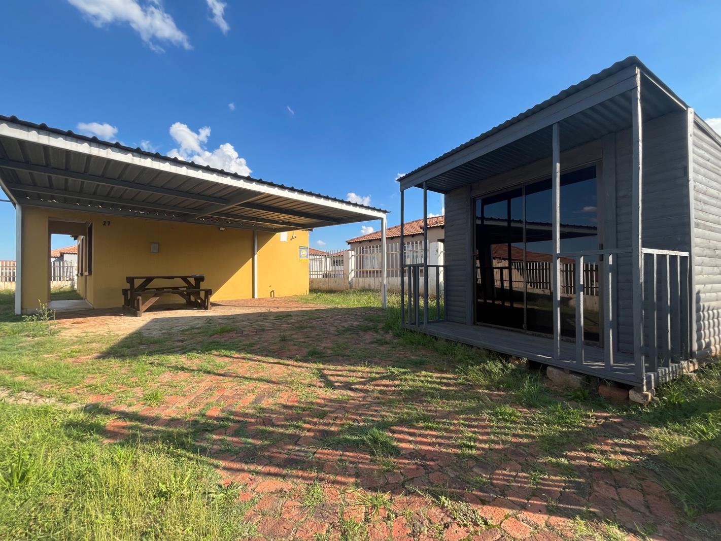 There are 2 bathrooms, a well-sized kitchen, and ample outdoor space, including 2 covered parking bays and a Wendy house, adding extra storage or utility use.