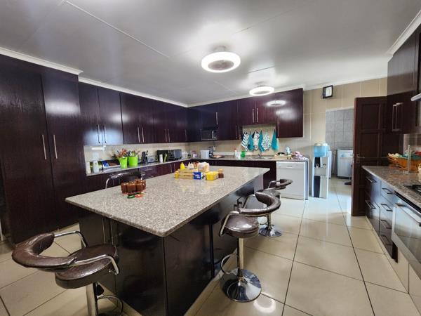 The kitchen can be described as spacious, with a modern look, lots of built-in cupboards, granite tops and a vast centre island.