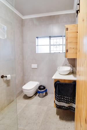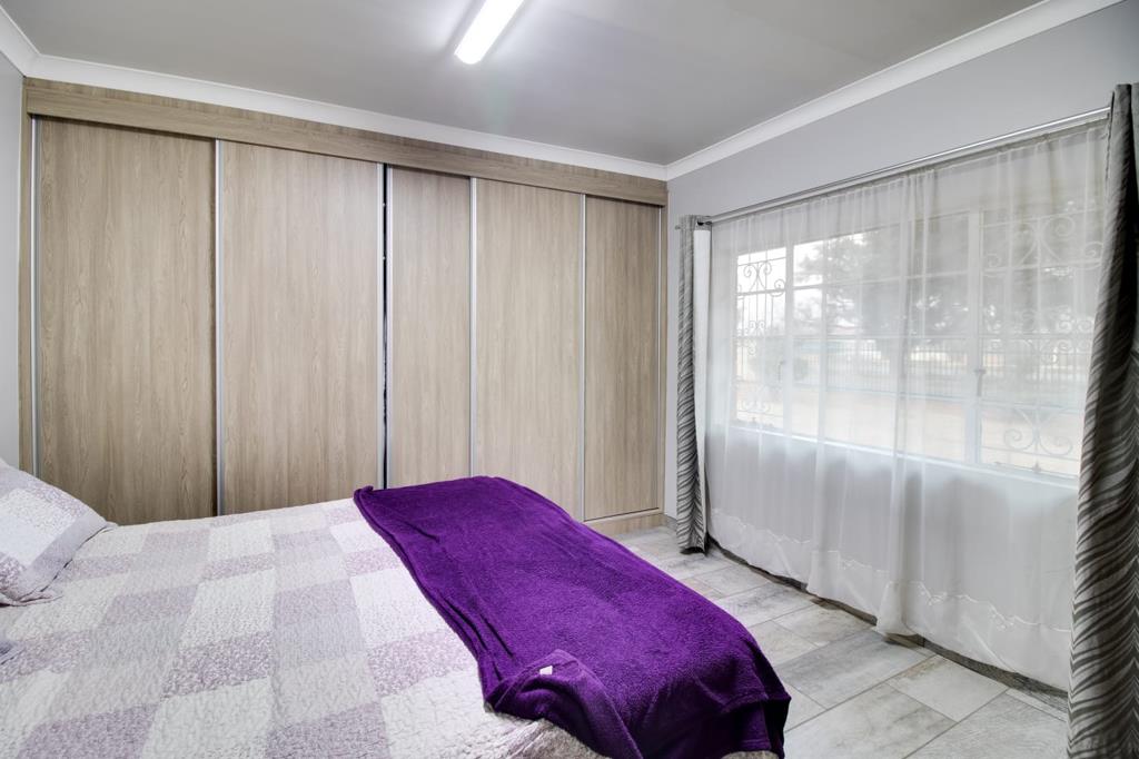 3 well-sized bedrooms with built-in cupboards. Modern bathroom with shower, basin, and toilet. Additional separate toilet for convenience. Open-plan lounge and dining area with a cozy fireplace, leading out through sliding doors to the garden. Fully fitted kitchen with a gas stove.