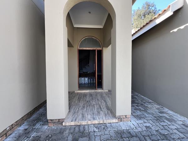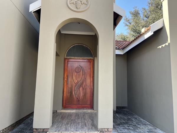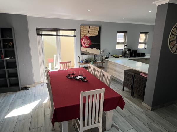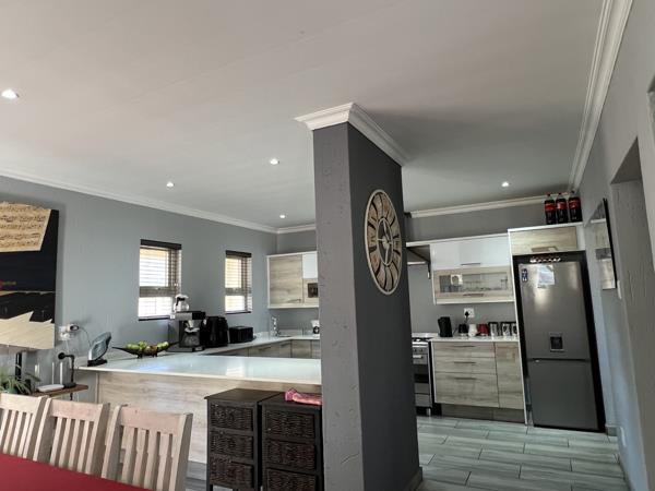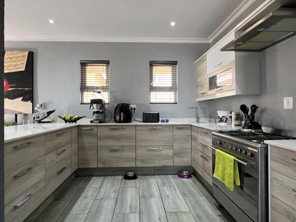 The open-plan layout creates a natural flow between the living and dining areas and the contemporary kitchen, making everyday living feel seamless and relaxed. The kitchen is beautifully finished with ample built-in cupboards, a pantry, and a gas SMEG stove perfect for uninterrupted cooking during load-shedding while adding a touch of sophistication.