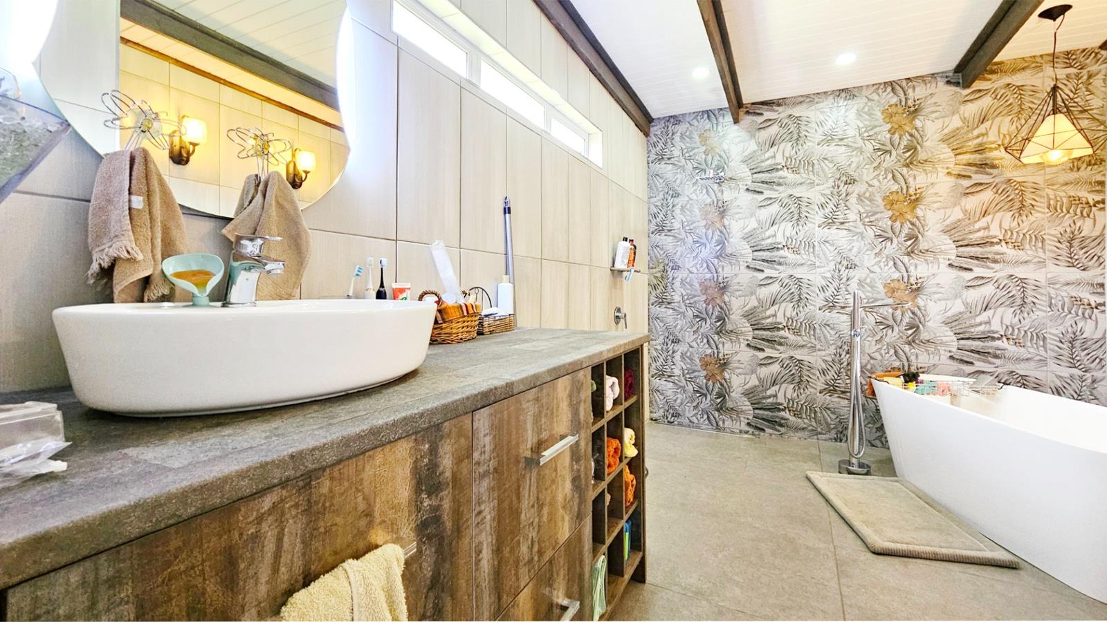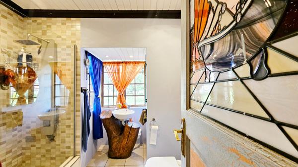 Accommodation is surprisingly generous, comprising a large lounge with a fireplace and laminated wood flooring, a large dining room that is open-plan to a lovely kitchen with a five-ring gas hob, three bedrooms the master bedroom with space for a pyjama lounge with exposed beams and a hobby room, and two contemporary bathrooms with ambient lighting in the en-suite.