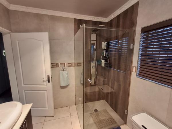 The home comprises three comfortable bedrooms and two bathrooms, including one en-suite, providing convenience and privacy. Bathrooms feature a mix of styles, from a modern glass-enclosed shower to a functional enclosed shower.
