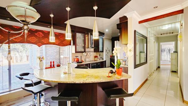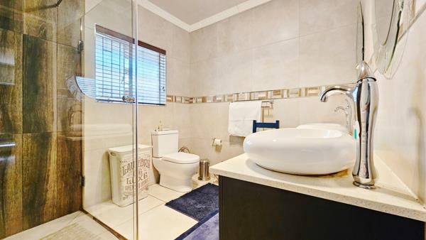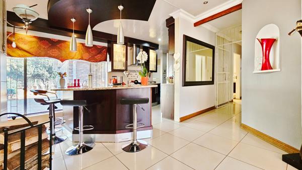 This North-facing home enjoys a sizable stand with a double garage, and ample additional parking space under two high-quality carports for five vehicles behind lockable gates. Outside features a pleasant enclosed lapa, a separate enclosed entertainment room with a built-in bar, a jacuzzi, and a patio with a built-in braai as well as a separate home office.