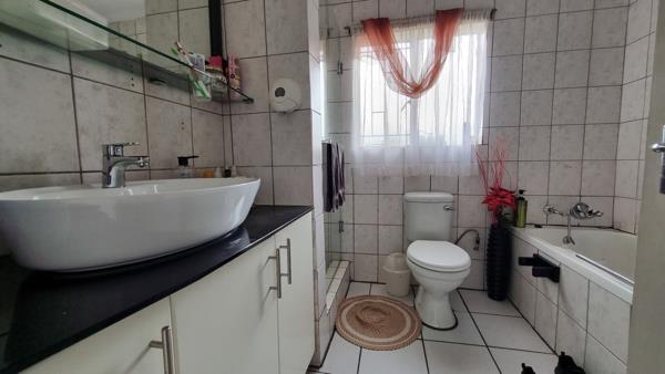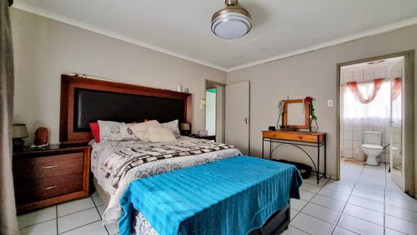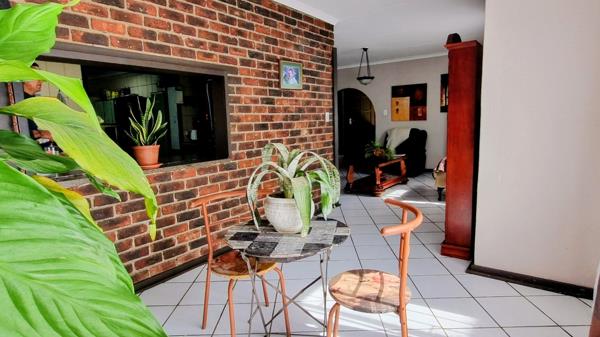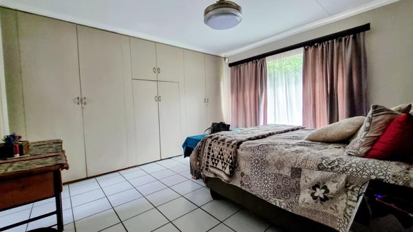 The house has 3 bedrooms with built-in cupboards. The main bedroom has an en-suite bathroom with a bath, shower, basin and toilet. The second bathroom has a bath, basin and a toilet. A study room provides a dedicated space for work or reading. The spacious kitchen has wooden, built-in cupboards and a 5-plate gas stove and oven. There is also a spacious pantry. A separate scullery and separate laundry room add convenience for daily tasks. The cozy lounge has sliding doors into the inside garden and the dining room accommodates family meals. The TVfamily room with a built-in bar is adjacent to the entertainment and outside braai area and has a sliding door leading out to the backyard and swimming pool.