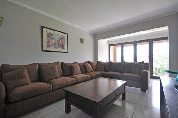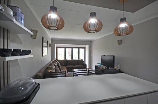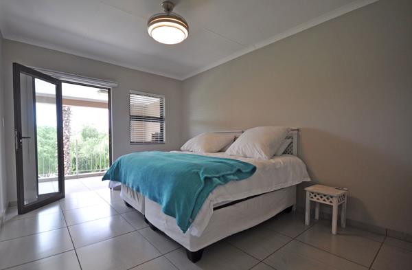 The open plan living and dining room looks onto the balcony with breathtaking views of the Vaal River and communal gardens with lush lawn. The unit is complete with a modern kitchen and sleek Ceasar stone countertops.