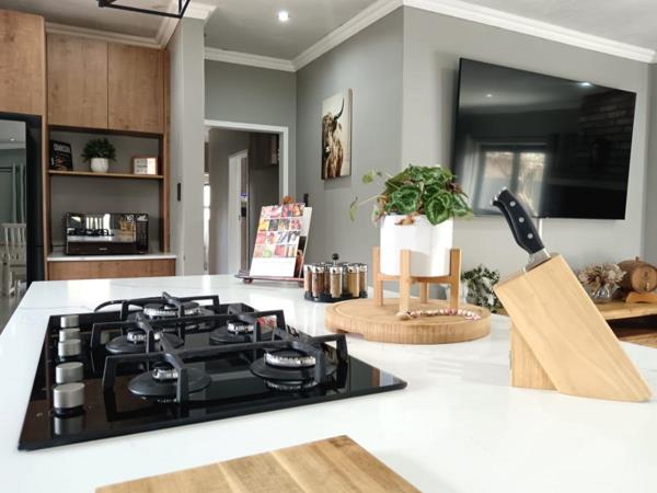 * Kitchen with sleek counter tops, gas hob and electric oven
