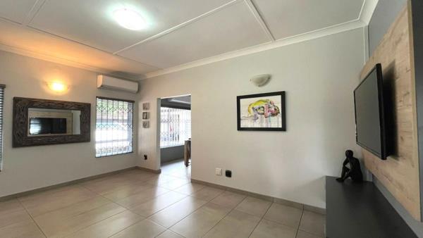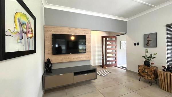 The entertainment room is equally divined, complete with a built-in braai, leading with sliding doors outside to a private oasis with a sparkling heated pool surrounded by elegant decking and lush lawn, all perfectly complemented by a covered pergola, ideal for entertaining or relaxing outdoors.