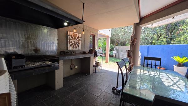 An elegant bar with a fitted counter and back-bar shelving opens through doors onto a covered veranda with a built-in braai, perfect for entertaining family and friends.