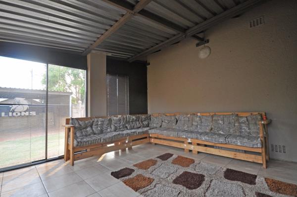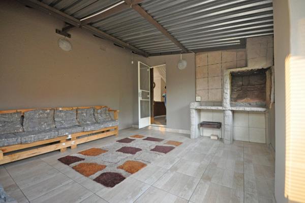 Enter into an open plan lounge and dining room with access into a covered recreation area with built-in braai.