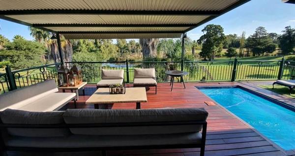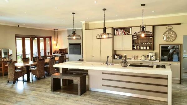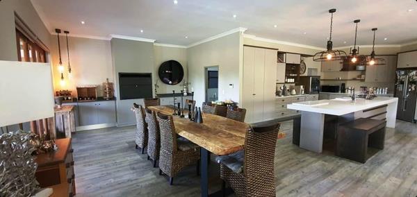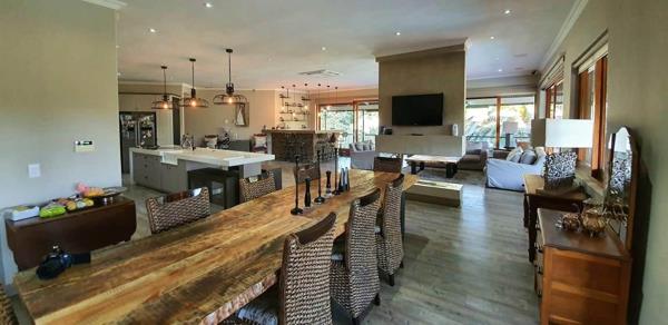 Designed with style, class, sophistication and comfort. All the reception rooms with their floor to ceiling wooden framed stack doors, open onto the wrap-around veranda overlooking the landscaped and manicured gardens leading down to the river. The open plan kitchen, dining room, lounge and bar nook, leads onto the veranda boasting a jacuzzi pool with a view over magnificent sunsets. A gas fire place keeps these reception rooms cozy and warm. There is also a built-in braai in the dining room.