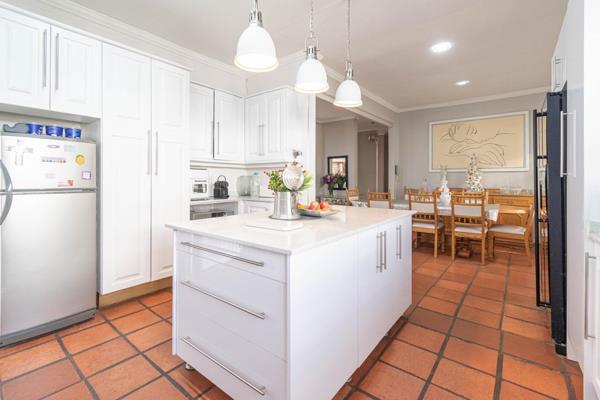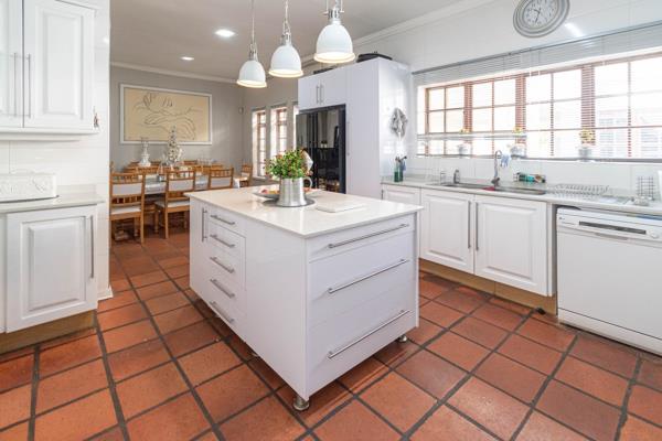 A beautifully appointed kitchen, featuring a central island with Caesarstone countertops, a gas hob, and stylish pendant lighting, is the heart of the home.