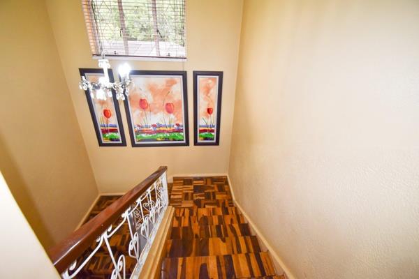 The beautifully landscaped garden offers a peaceful sanctuary to relax. An undercover patio, complete with a bar counter and a built-in braai, offers the perfect setting to unwind and entertain against the backdrop of a manicured garden and a sparkling pool. A jungle gym and a trampoline to keep the kiddies entertained.