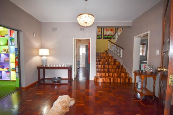 The welcoming entrance opens to a grand foyer with rich wooden flooring leading into on the one side, a formal lounge perfect for intimate gatherings and a dedicated study and on the on the other side, into a grand dining room and in front of you, a teak wooden staircase adorned with a chandelier to take you to the upper level of this majestic home featuring bay windows.