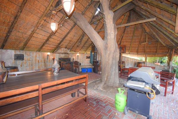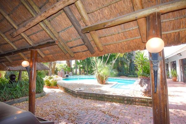 The main house boasts three large north-facing bedrooms with two and a half bathrooms and a guest cloakroom. The master bedroom is a breathtaking retreat, offering mirrored sliding cupboard doors, a Hollywood style bathroom and sliding doors opening onto a thatch covered Jacuzzi.