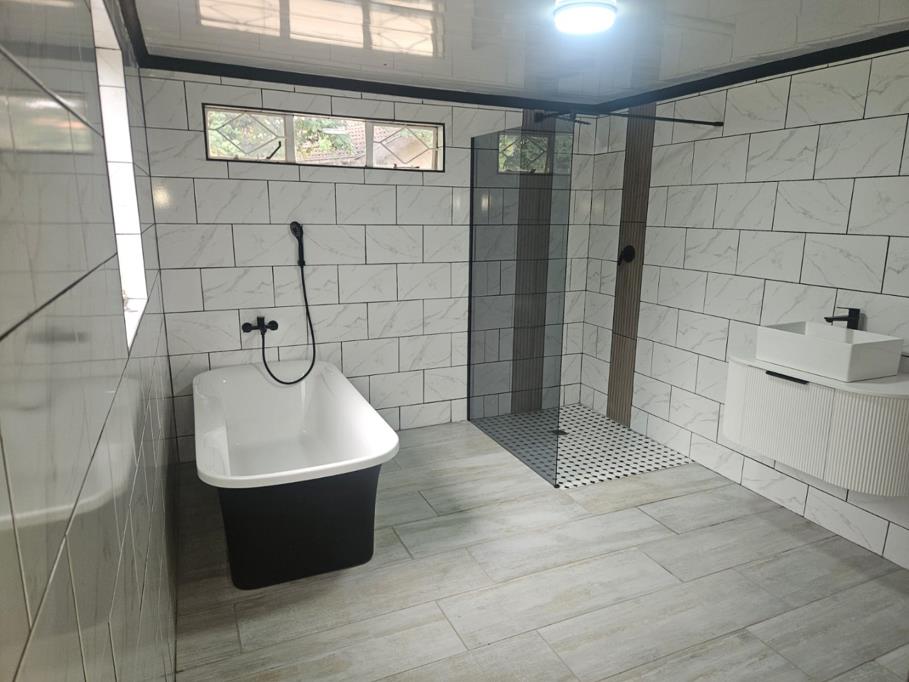 This home boasts three well-proportioned bedrooms, including a master suite with its own en-suite bathroom. Both of the property''s two bathrooms are a true highlight, showcasing a sleek, contemporary design. They feature elegant white marble-look subway tiles, light wood-look floor tiles, and luxurious freestanding black and white bathtubs. Walk-in showers with glass partitions and stylish black fixtures complete these sophisticated spaces, ensuring a spa-like experience.