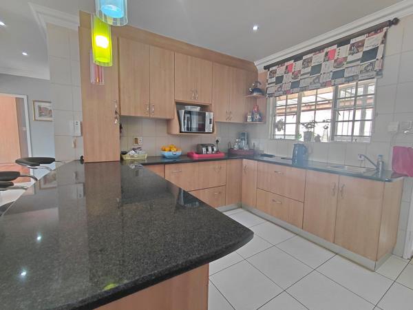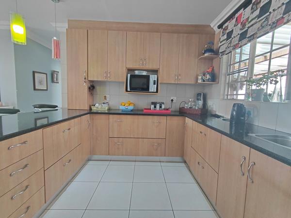 The spacious U-shaped kitchen features matching wood cabinetry and sleek granite countertops, leading into a separate scullery that keeps the main area clutter-free. It is outfitted with a large, stainless steel Elba gas stove and oven, ensuring efficient cooking and a backup plan during power outages.