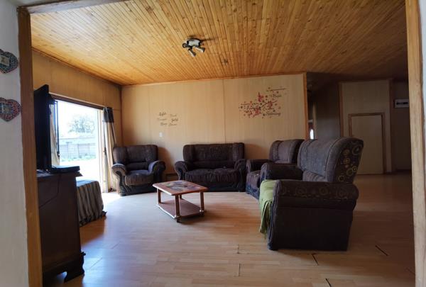 Four-bedroom home in Three Rivers. This family home with spacious living areas - lounge, open plan tv- and dining room offers a melamine kitchen with undercounter oven and a breakfast nook.