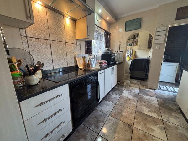 The kitchen is well-appointed with granite countertops, a glass hob, oven, & extractor fan, complemented by a separate scullery with a double sink for added convenience.