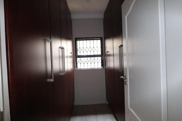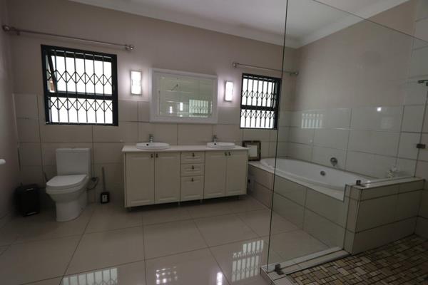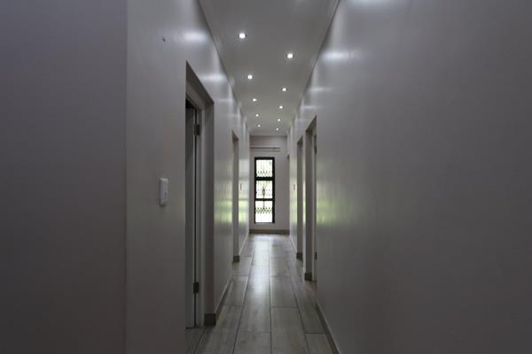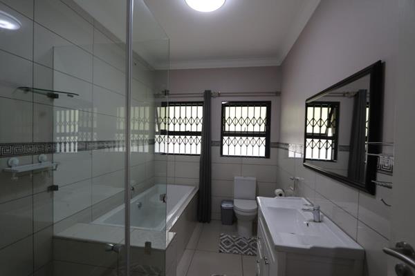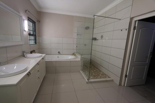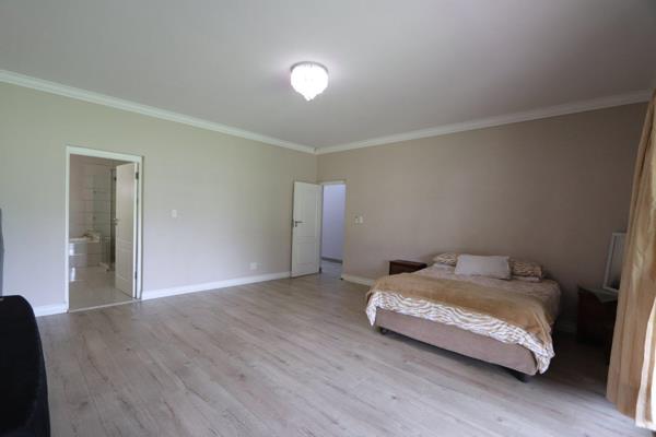 The kitchen is well-equipped with a gas stove, ample storage, and a separate pantry. A dedicated laundry room adds convenience. The property boasts a double garage with electric doors, ensuring security and ease of access. Additional facilities include a workers room, two storage rooms, and a small lapa overlooking a sparkling poolideal for outdoor entertainment.