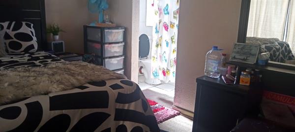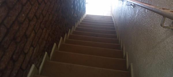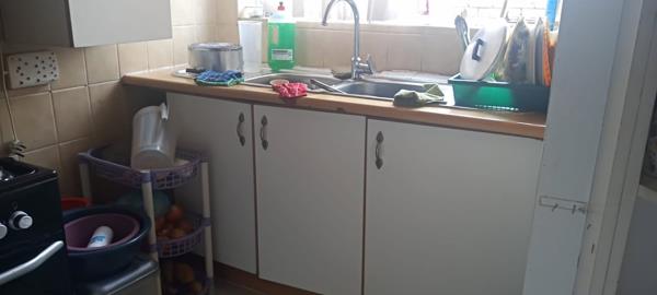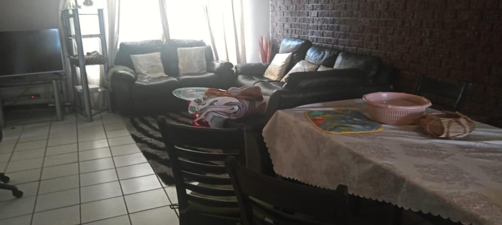 three-bedroom townhouse in vereeniging. Double-story townhouse with open plan living room, kitchen with melamine cupboards and a guest toilet on the ground floor.