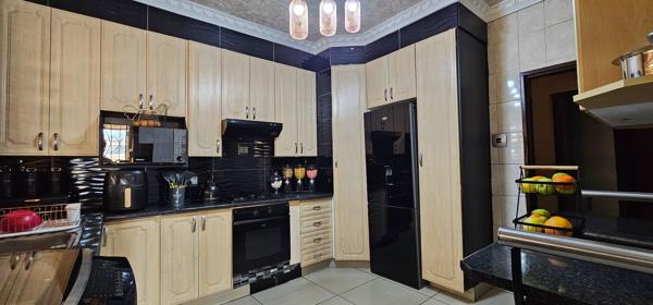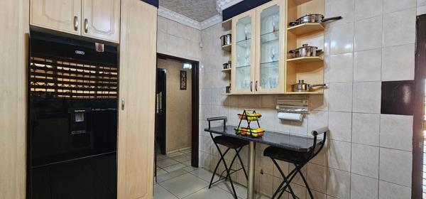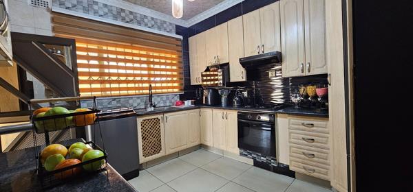 Four-bedroom home in Vereeniging. Neat and spacious family home offering an open plan lounge and dining room and a beautiful modern melamine kitchen with breakfast nook, undercounter oven and hob.