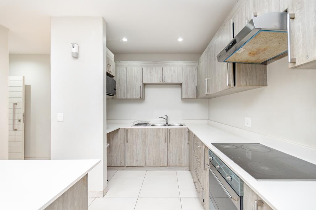The kitchen is positioned at the heart of the home and is finished with white granite countertops, light wood cabinetry, and a central island. It is equipped with an electric hob with extractor, oven, and space for a double-door fridge and one under-counter appliance creating a practical yet stylish workspace, well suited to both daily living and entertaining.