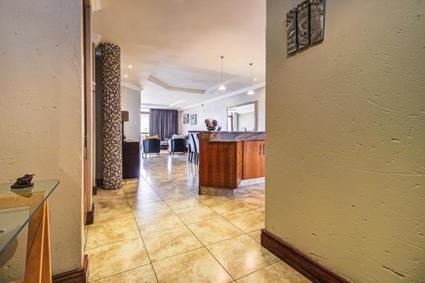 The stylish lounge with a closed fireplace flows effortlessly into a separate dining room ideal for entertaining in style. Step out onto the private balcony with a built-in braai and washbasin, perfect for relaxed outdoor living.