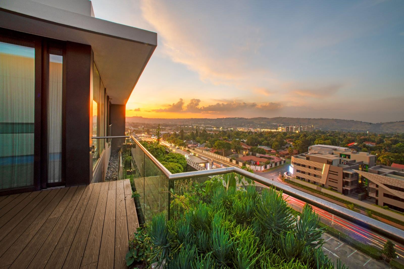 The master bedroom is flooded with light and enjoys 180 views of JHB through large sliding doors. It features ample built-in cupboards, a dressing area, and an en-suite full bathroom with a smoked glass shower, custom double vanity, and Italian porcelain. The second and third bedrooms are equally spacious with easy access to the deck and balcony, both featuring built-in cupboards and en-suite full bathrooms.