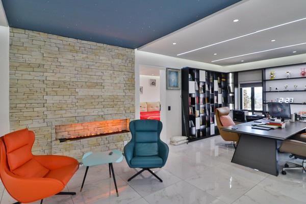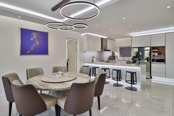 Stylish kitchen with Ceasar stone tops, a breakfast bar, space for a double door fridge/freezer, and lots of cupboard space opens up to an elegant dining room with an 8 seater table with Bentley dining chairs, a beautiful lounge, and a home study or office with stunning built-ins.