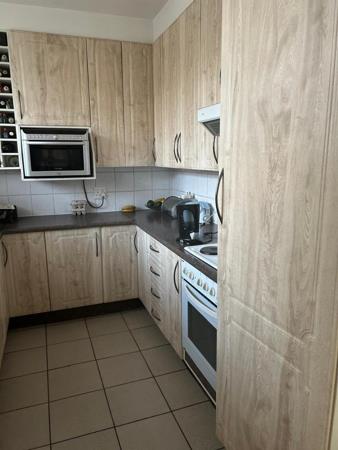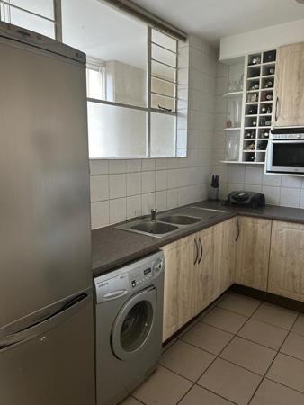The kitchen in this apartment boasts a sleek and modern design with light wood cabinetry offering storage space for all your essentials. The dark countertops complement the light wood, creating a stylish contrast. There''s also a built-in oven and stove, with a space for washing machine and fridge along with extra shelving, offer added convenience. making it functional and convenient for daily use.