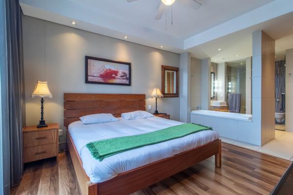 This apartment offers 1 large bedroom with an open plan en-suite bathroom complete with shower and bath. There is also a guest toilet and lots of cupboard space. The kitchen comes complete with granite tops, Bosch oven, and a glass hob. A built-in dining table that leads to the open plan lounge area.