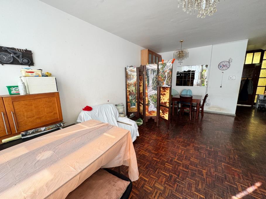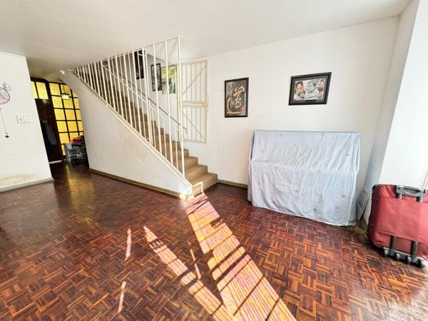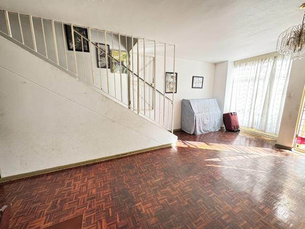 Step inside to discover a generous open-plan lounge and dining area with high ceilings throughout, creating an airy and inviting atmosphere. The renovated kitchen offers ample cupboard space, modern cupboard doors and countertops, and room for one under-counter appliance.