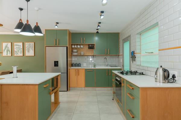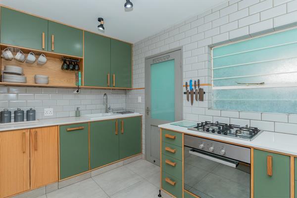 The heart of this home is the two-toned, open-plan kitchen featuring Caesarstone worktops, a large pantry, gas stove and electric oven, a stunning center feature island counter with cupboards and draws as well as wine display space. The kitchen has subway wall tiles adding to a clean and modern look. The kitchen flows into a spacious lounge with enough space for a dining area with hanging feature shelves and direct access to a private terraced garden and covered patio, a perfect spot to entertain friends and family with built in braai space.