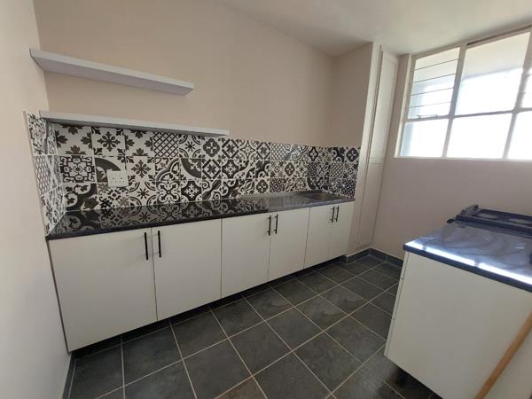 The renovated kitchen boasts sleek finishes, ample cupboard space, and a fresh, contemporary design.