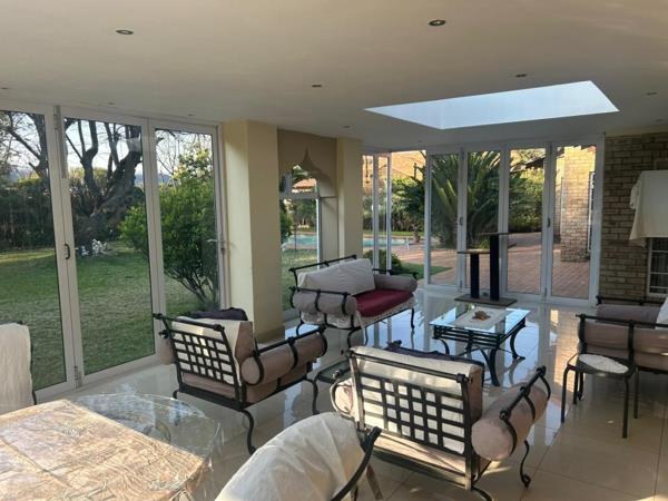 Outdoor features include a sparkling pool and a well-appointed braai area, perfect for entertaining. The home also includes staff accommodation, two garages, a carport, and additional parking. With 24/7 security, this property ensures peace of mind in a sought-after location.