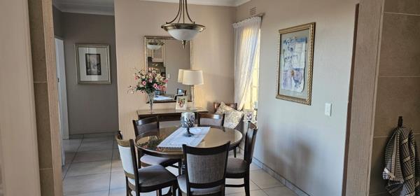The lounge is styled in neutral tones with a loose luxurious carpet. This up-market space exudes class and provides a comfortable entertaining area. Double-volume ceiling with wooden beams create an added feeling of space. Large north and west-facing windows allow the sunlight.to stream in. Good size balcony off the dining area provides more living space and allows for open-air relaxing, boasting beautiful sunsets. The rest of the home is fully tiled.