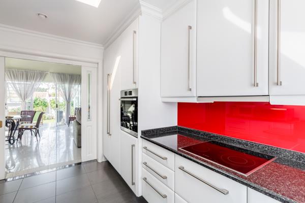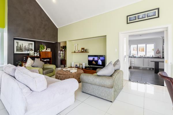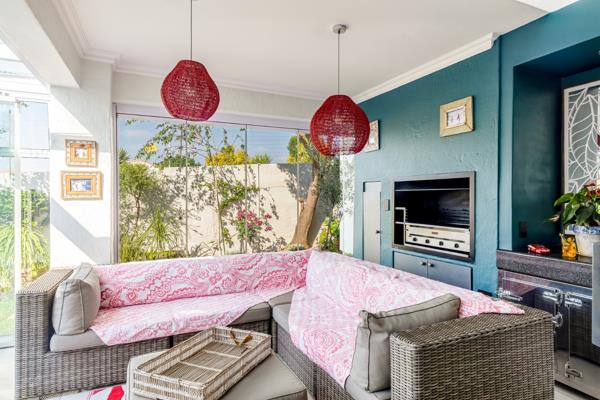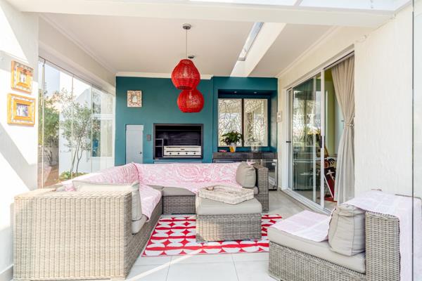A covered entrance with huge skylight welcomes you into a spacious, light-filled home. The open-plan lounge and dining area feature double-volume ceilings, creating a wonderful sense of space and flow - leading onto an enclosed patio with wrap around glass stacking doors a built-in braai, granite counter tops and cabinetry perfect for year-round entertaining. The patio leads out to a charming, low-maintenance garden with irrigation, ideal for alfresco dining or relaxing outdoors.