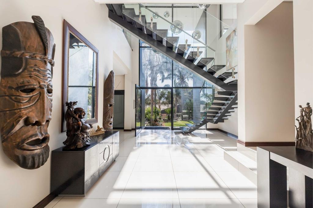 Set in an exclusive, high-security boomed enclave in sought-after Bedfordview, this architectural showpiece redefines contemporary luxury living. From the moment you arrive via the striking palm-lined driveway, this residence impresses with its bold, modern lines, towering glass facades, and an awe-inspiring double-volume entrance crowned by a dramatic, bespoke chandelier.
