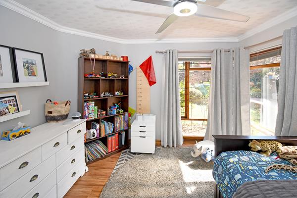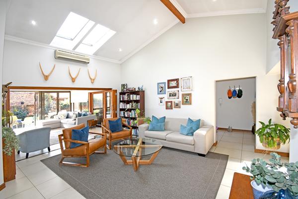 Accommodation includes three sunny bedrooms with laminated flooring, ceiling fans, and air conditioning. Two luxurious full bathrooms complement the home, with the master suite featuring a skylight, garden access, and a private dressing area. A dedicated study with built-in cabinetry adds convenience for remote work or study.