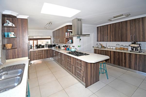 The large, well-appointed kitchen offers ample workspace and storage, with Caesarstone countertops, a gas hob, and modern finishes throughout.