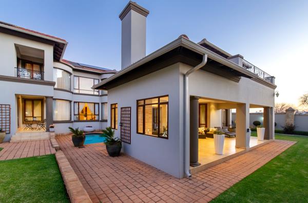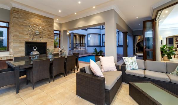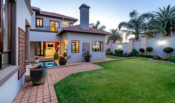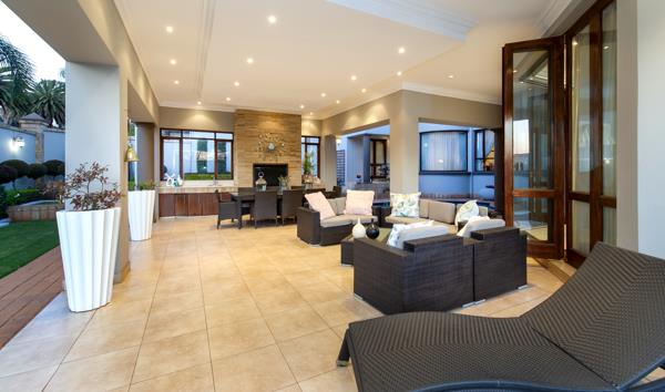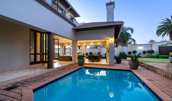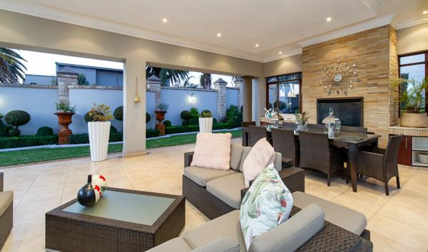The outdoor entertainment area in this Upper Bedfordview home is a showstopper, offering covered lounging and dining spaces, a built-in braai , manicured irrigated garden, and a sparkling solar-heated poolan entertainers paradise designed for year-round enjoyment.