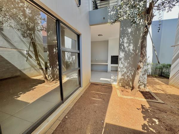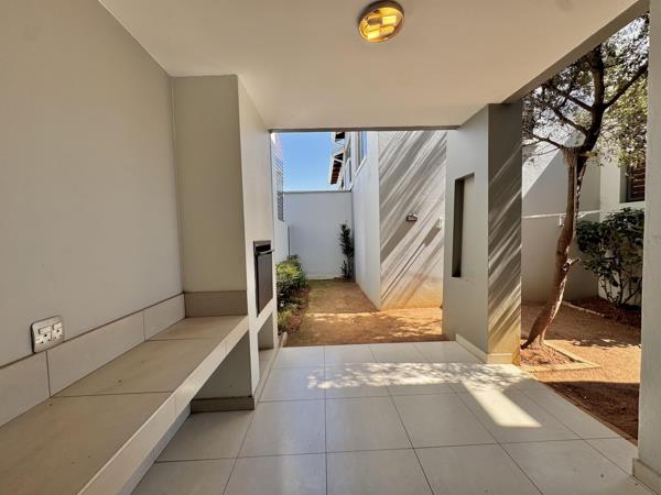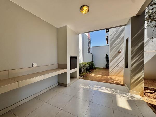 The outdoor entertainment area features a private garden and built-in braai, creating a seamless indoor-outdoor flow for family gatherings and weekend hosting.