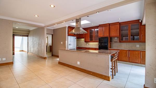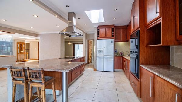Multiple living and dining spaces include both formal and informal dining areas, as well as inviting lounge options that offer flexibility for relaxation or hosting. Skylights throughout the house fill the interiors with natural light, enhancing the sense of space and warmth. The open-plan kitchen is equipped with granite countertops, a separate scullery and a dedicated laundry area, ensuring practicality without compromising style.
